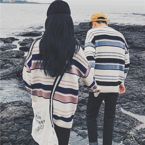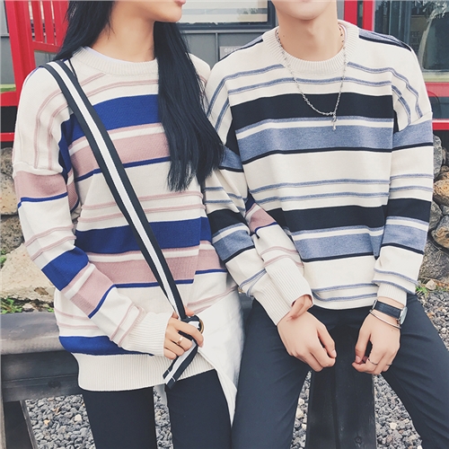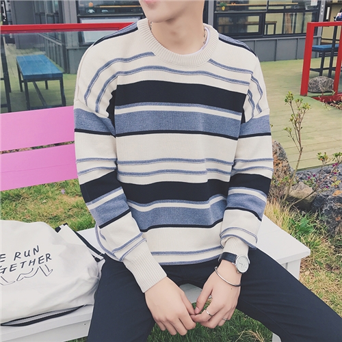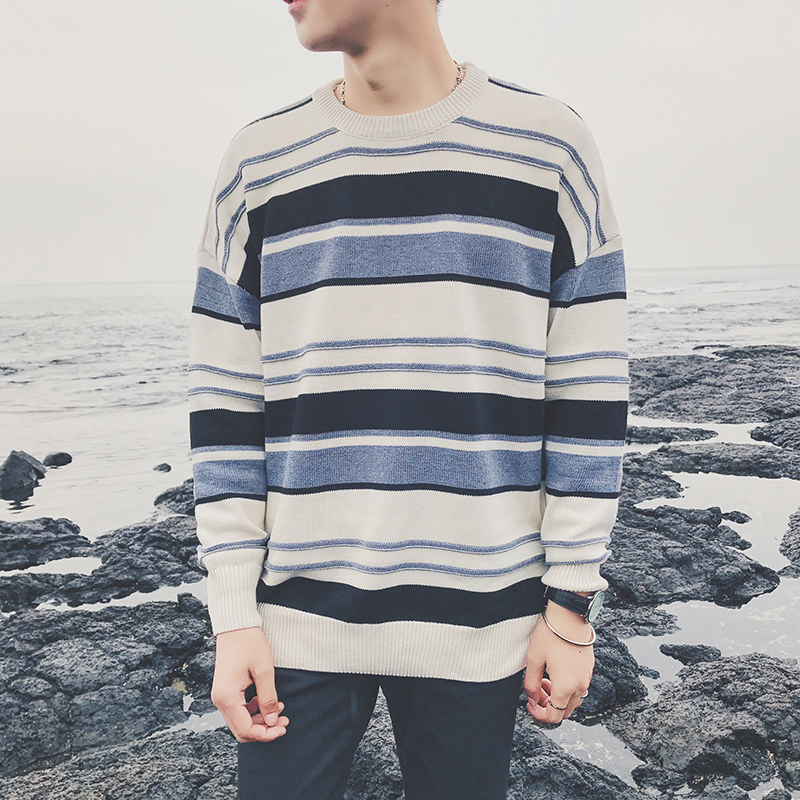男裝韓版小清新條紋圓領男士寬松衛衣套頭情侶衛衣