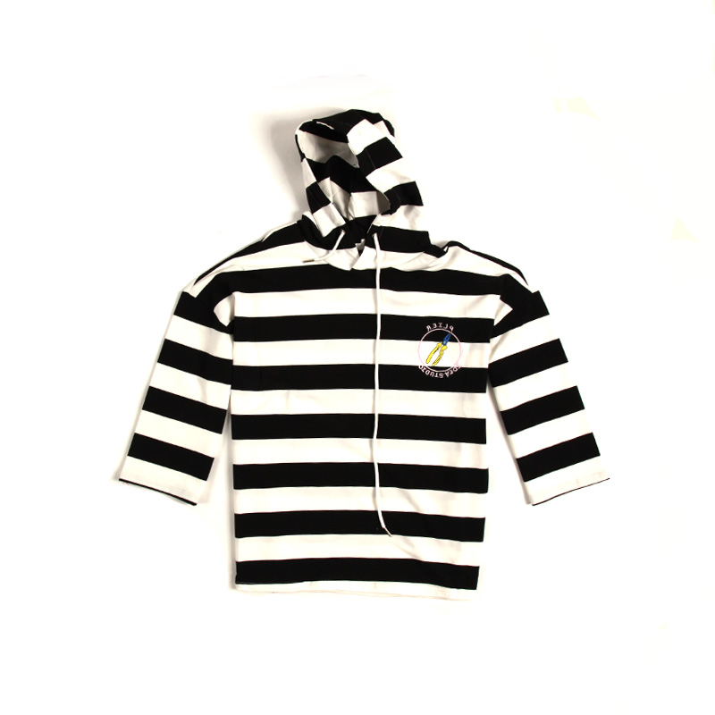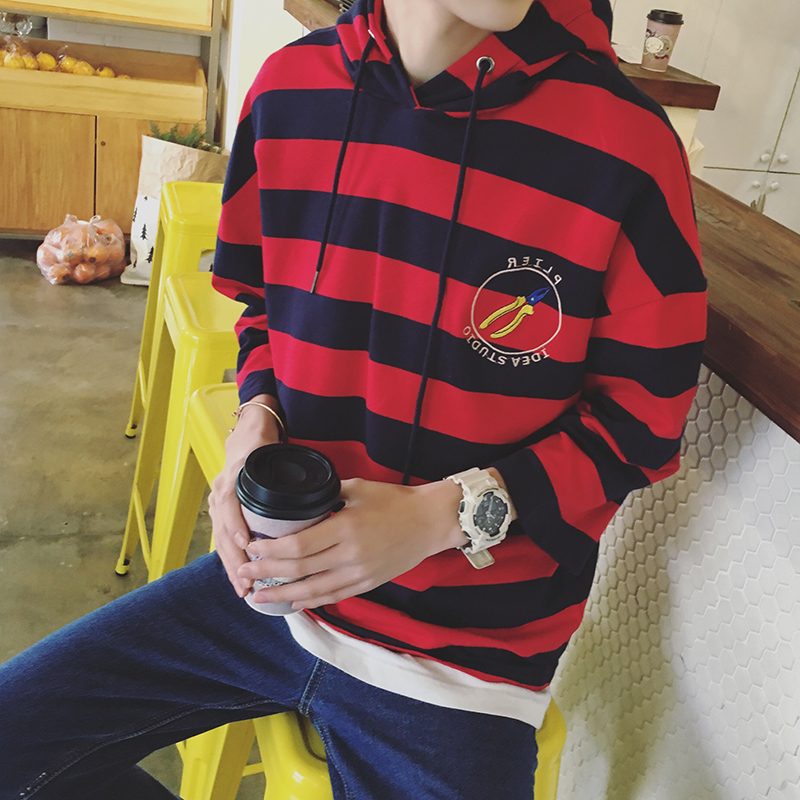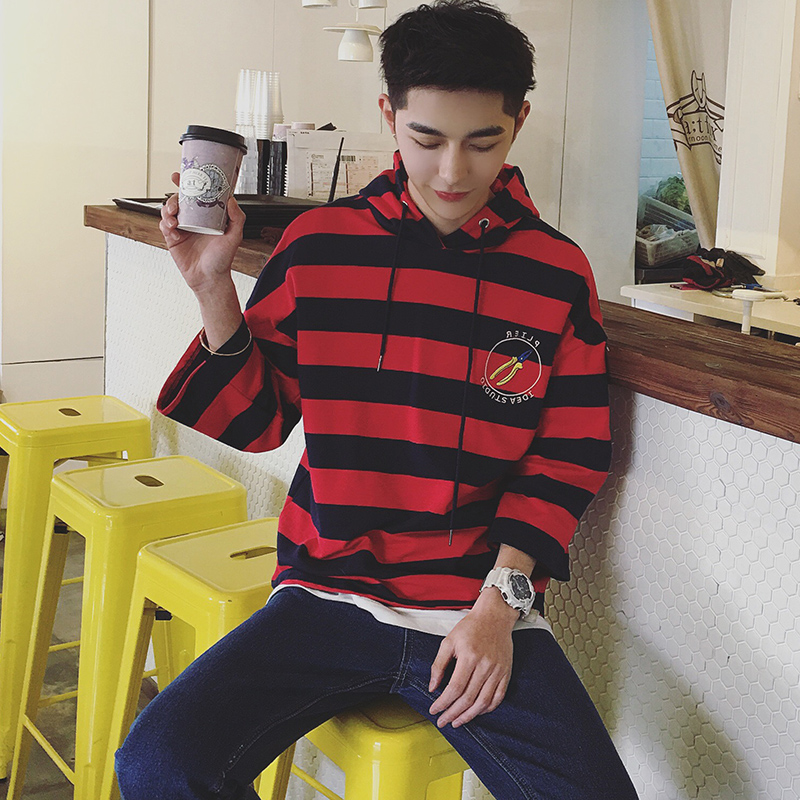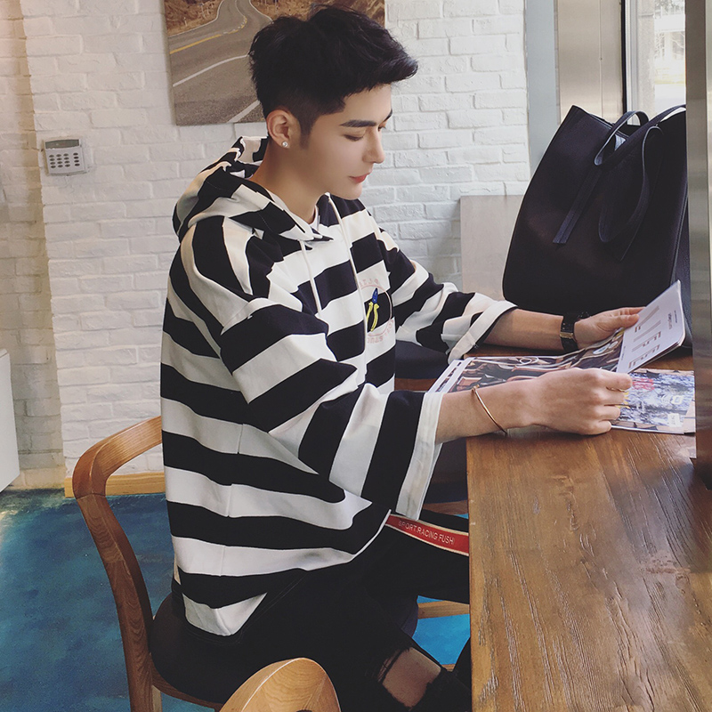 / 港風秋裝港系文藝連帽寬松套頭男士休閑條紋衛衣潮