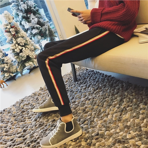 / 男裝撞色織帶韓版修身小直腳男士加厚休閑褲運動褲