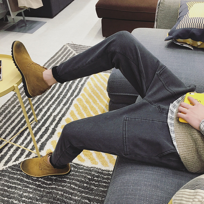 男裝后口袋貼布水洗韓版修身加厚小腳男士牛仔褲潮