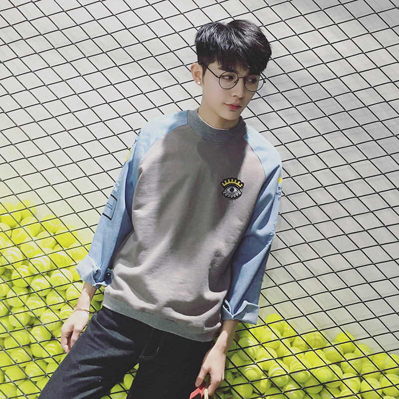 / 男裝牛仔拼接韓版寬松卡通男士衛衣插肩袖套頭衛衣