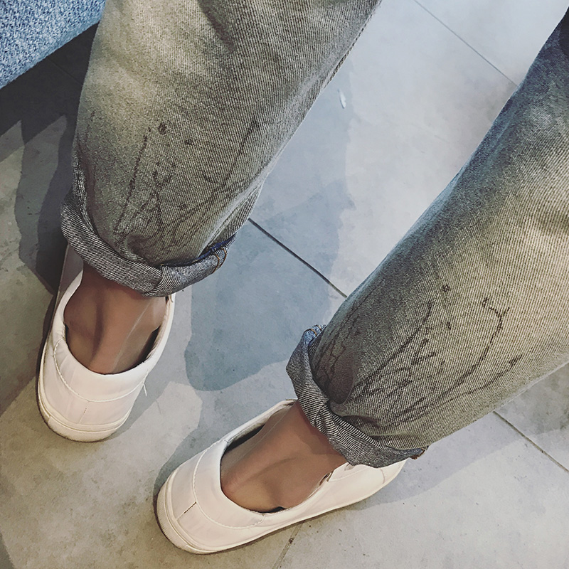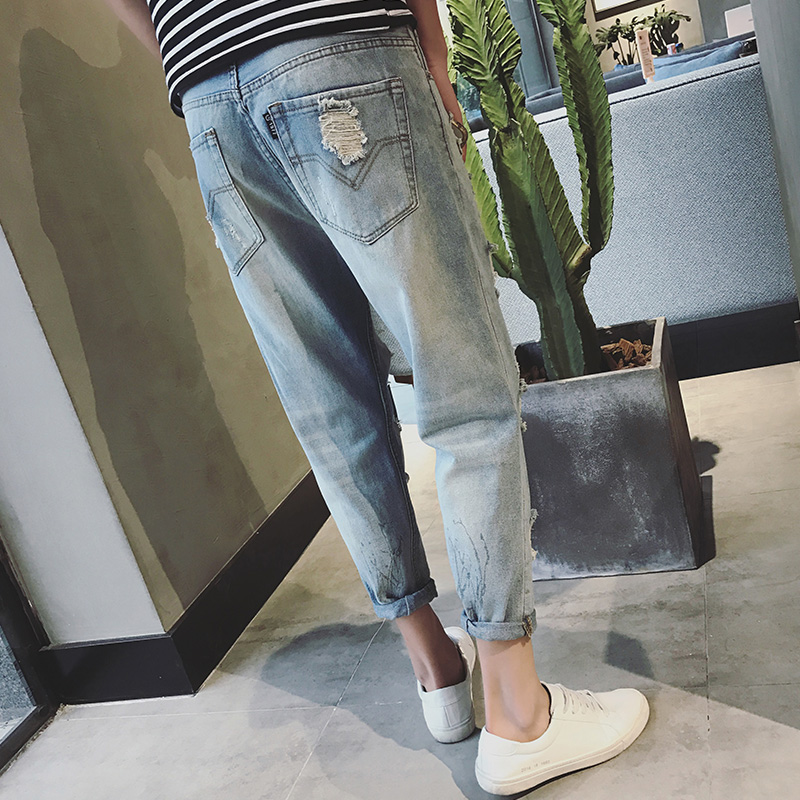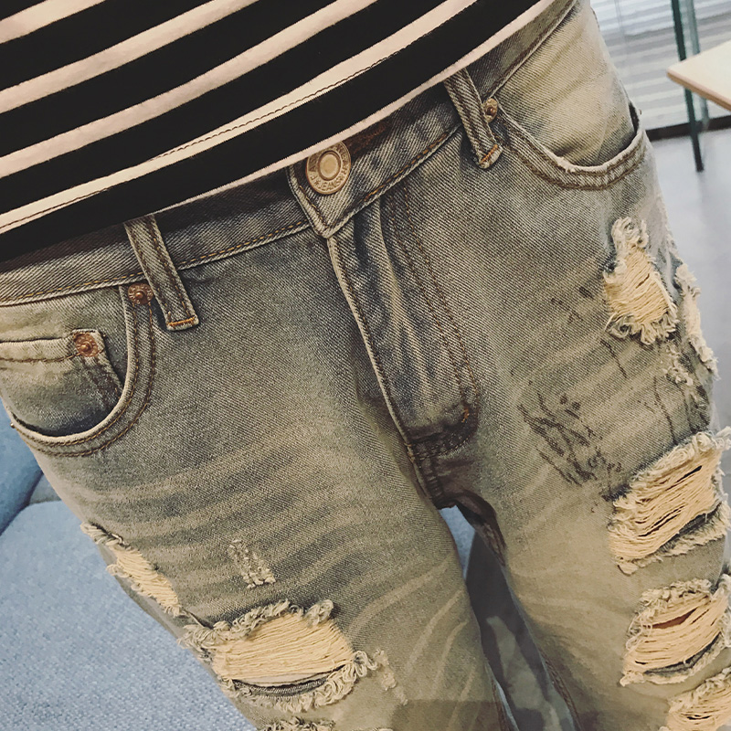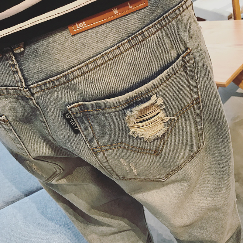 / 男裝韓版春裝男士破洞油漆牛仔褲小腳修身九分褲潮