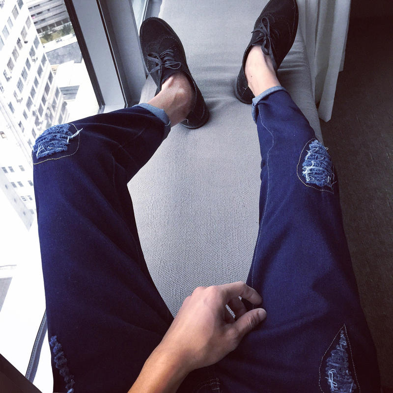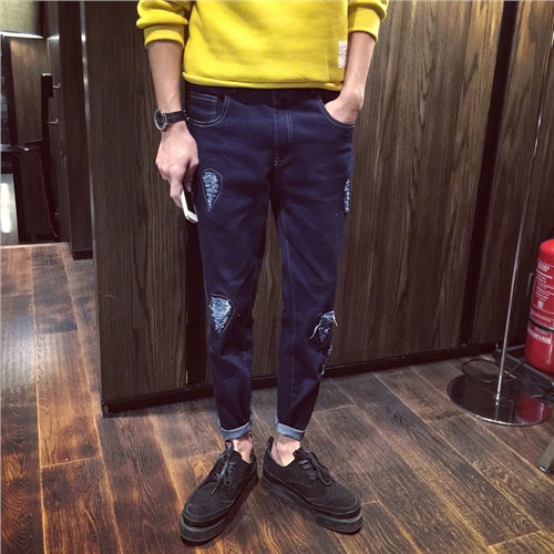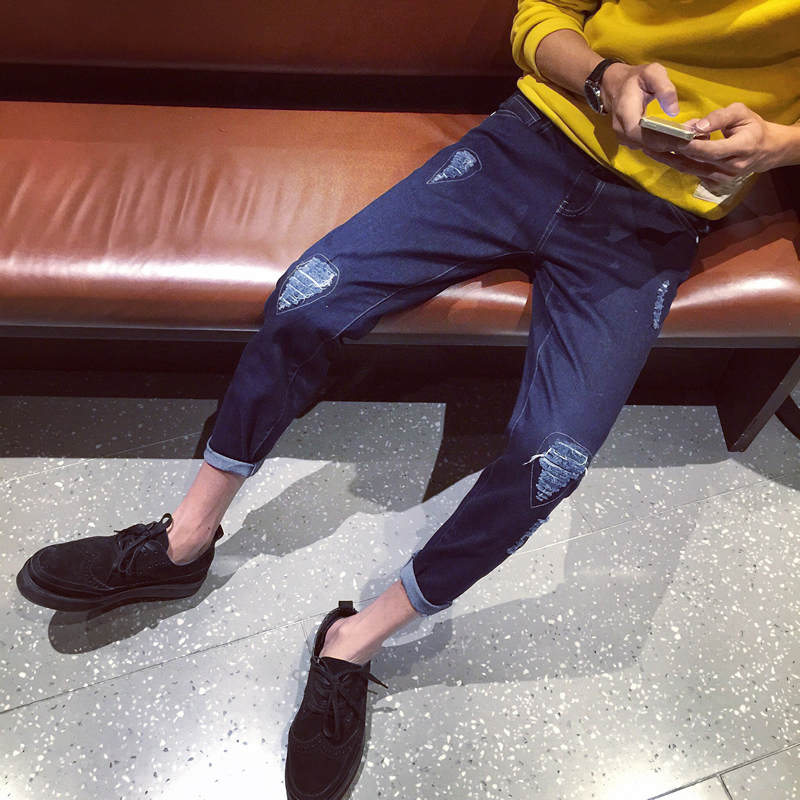 秋季新款韓版膝蓋補丁小腳錐形修身牛仔褲哈倫褲男