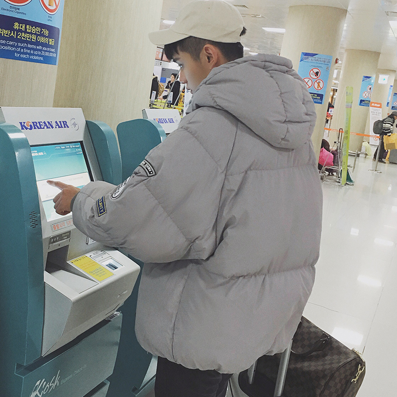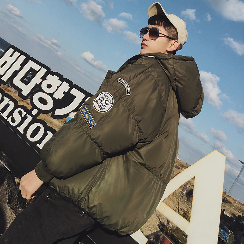 / 男裝徽章貼布落肩面包服韓版加厚連帽短款男士棉衣