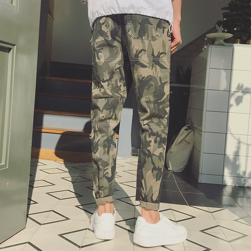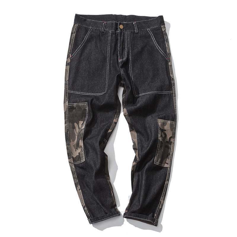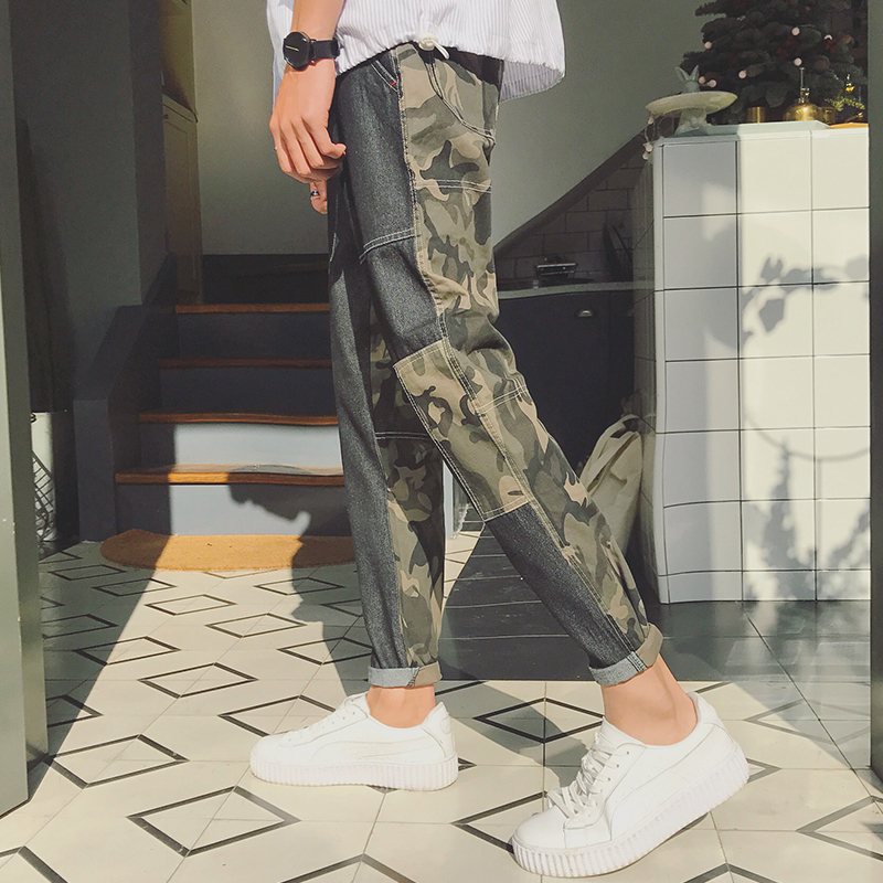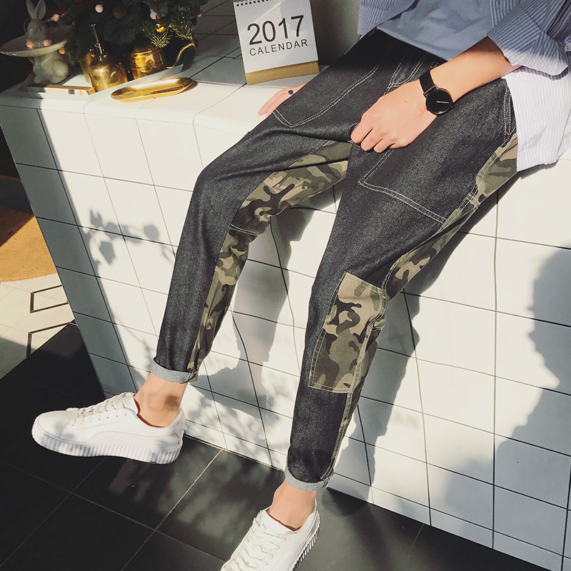 男裝韓版新款迷彩拼接修身小腳男士錐形褲牛仔褲潮