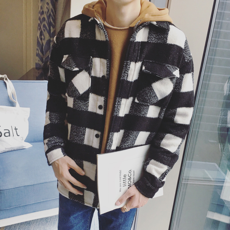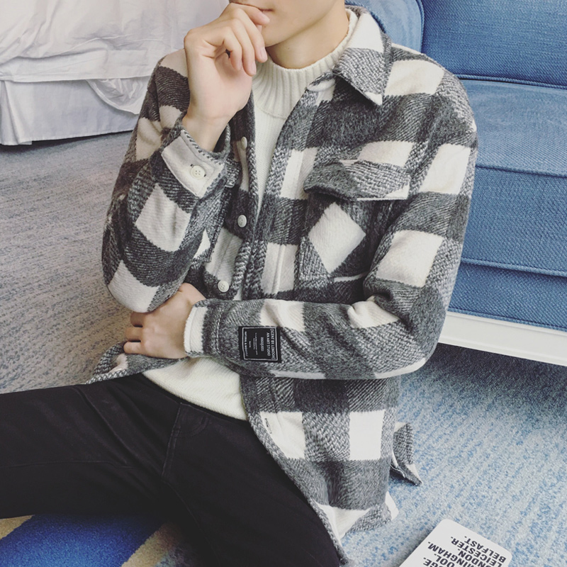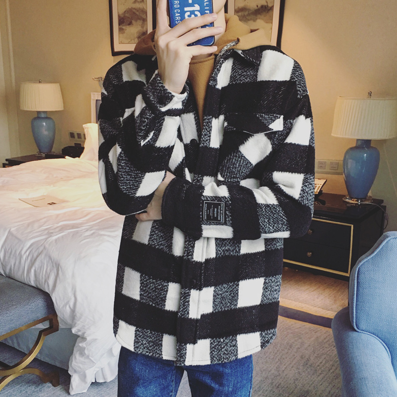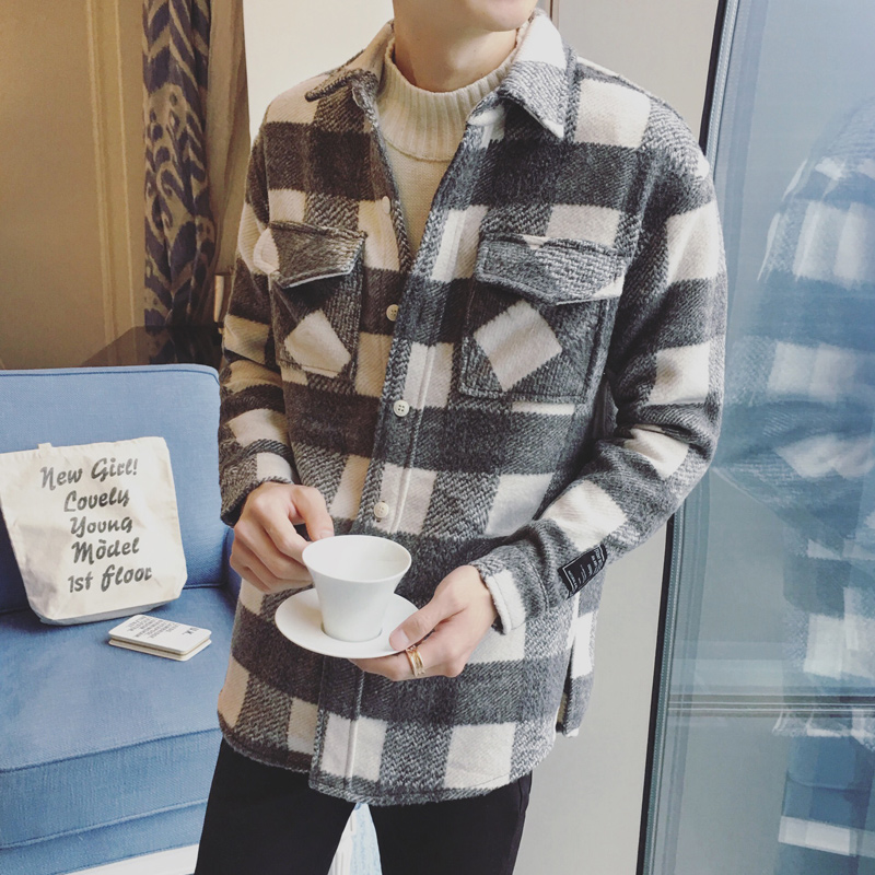 / 男裝韓版加厚加絨寬松男士打底衫尖領格子長袖襯衫