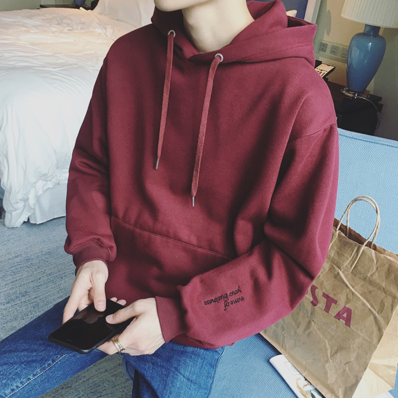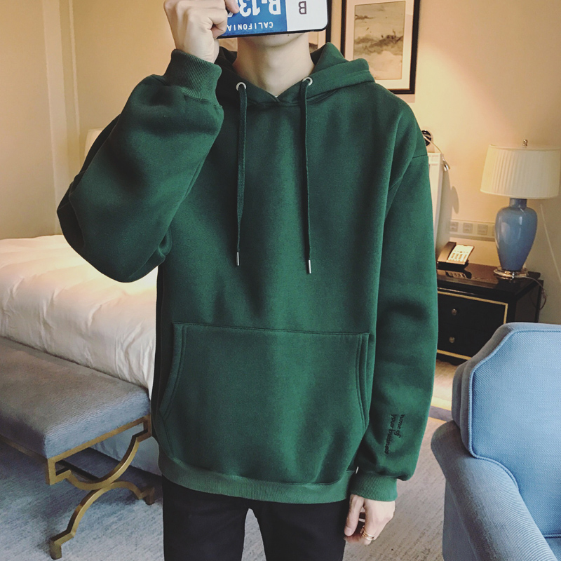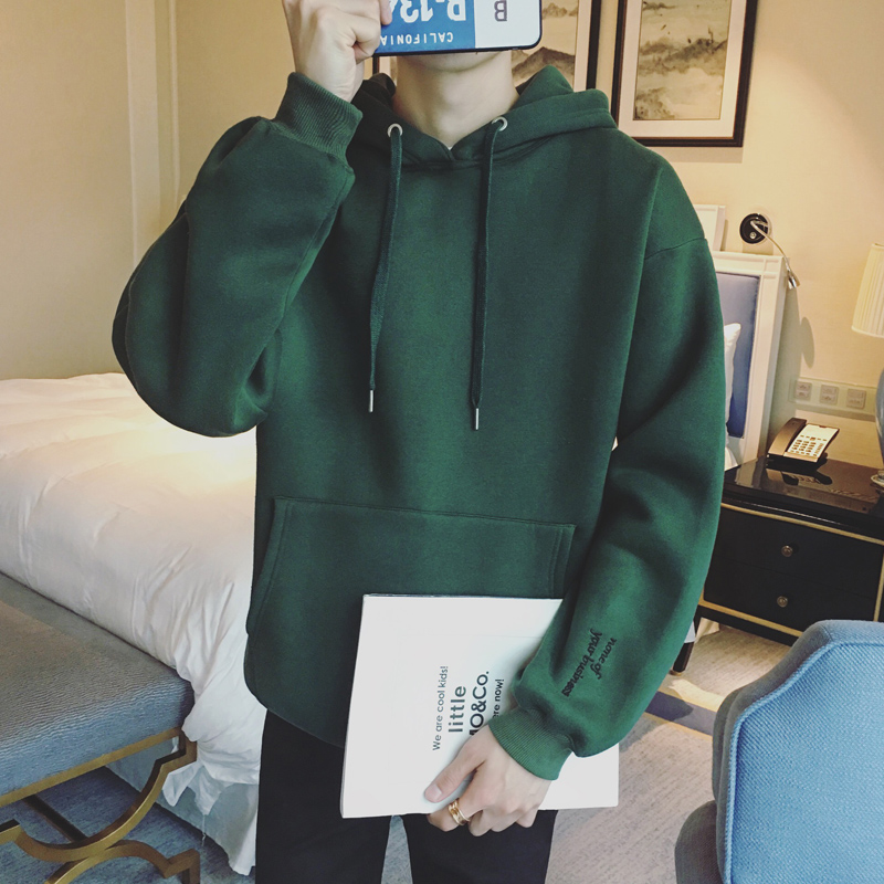 / 男裝字母刺繡韓版加絨加厚連帽套頭寬松衛衣外套