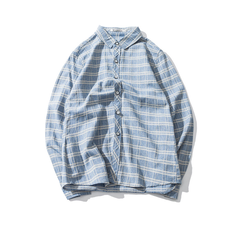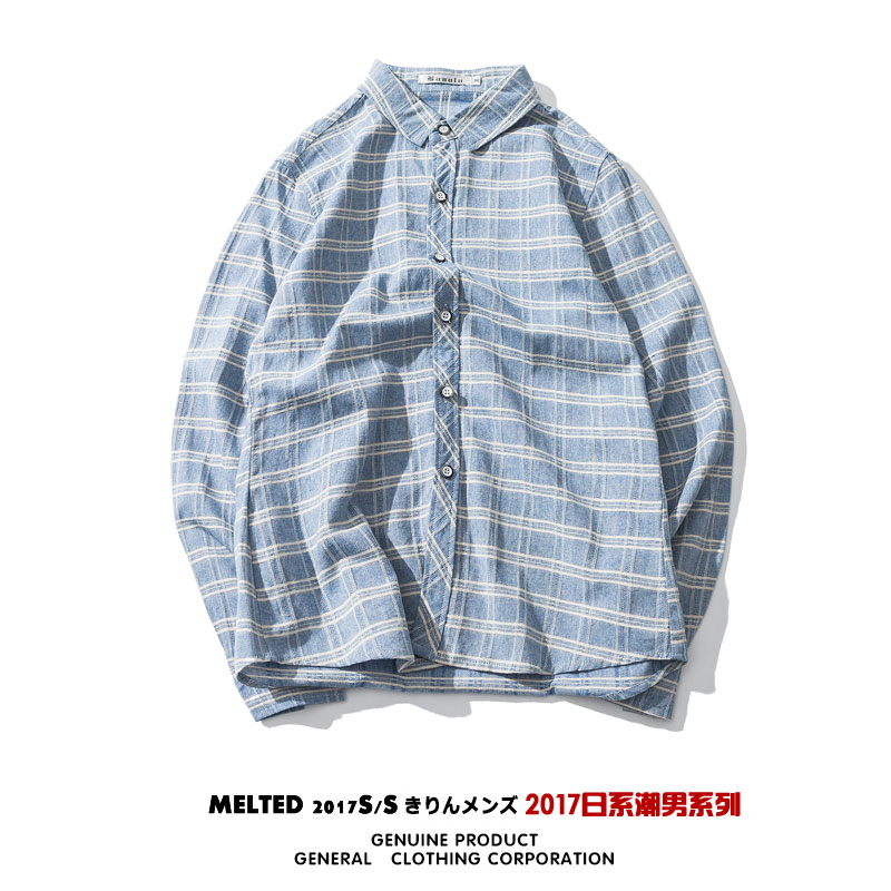 男裝日系復古彩格休閑男士長袖襯衫修身格子襯衣
