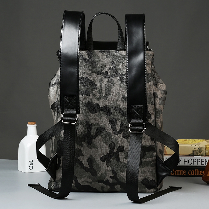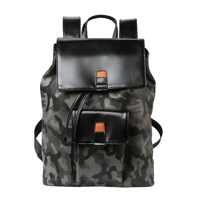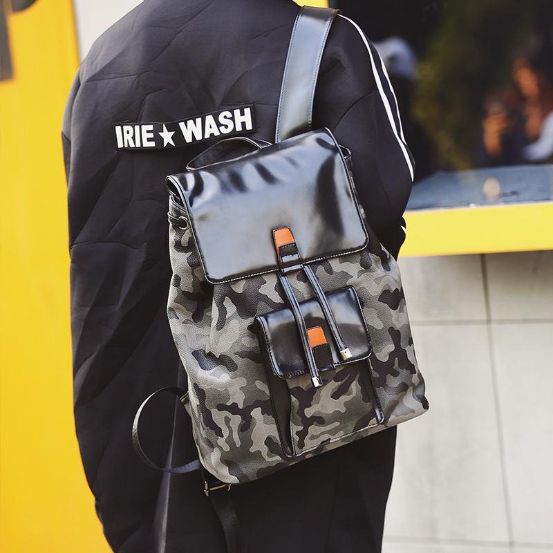 / 迷彩雙肩包男韓版皮質潮流翻蓋抽帶時尚背包學生書包男士旅行包