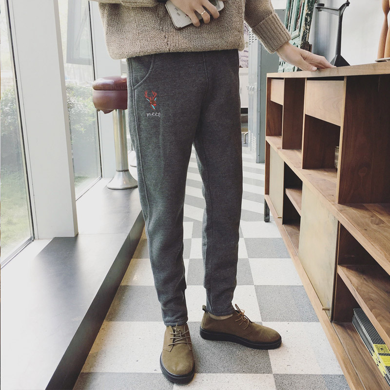 男裝日系復古小腳休閑褲小鹿刺繡加厚棉褲運動褲潮