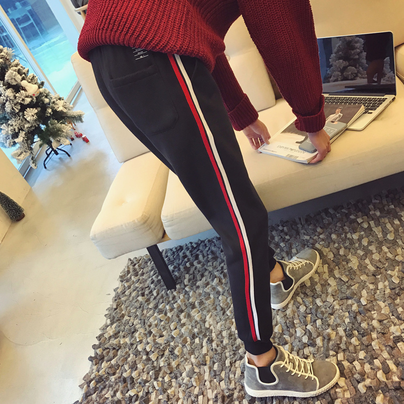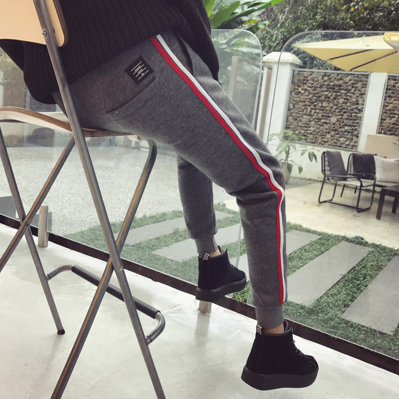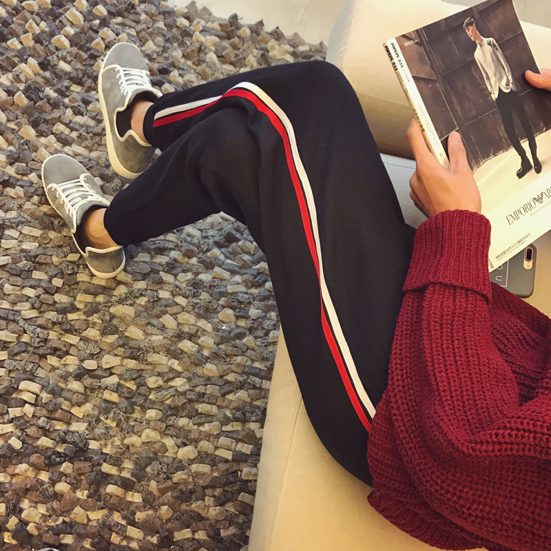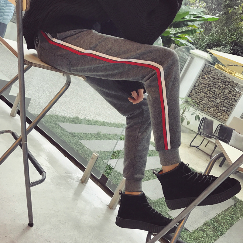 / 男裝港風撞色織帶韓版修身小直腳男士錐形休閑褲潮
