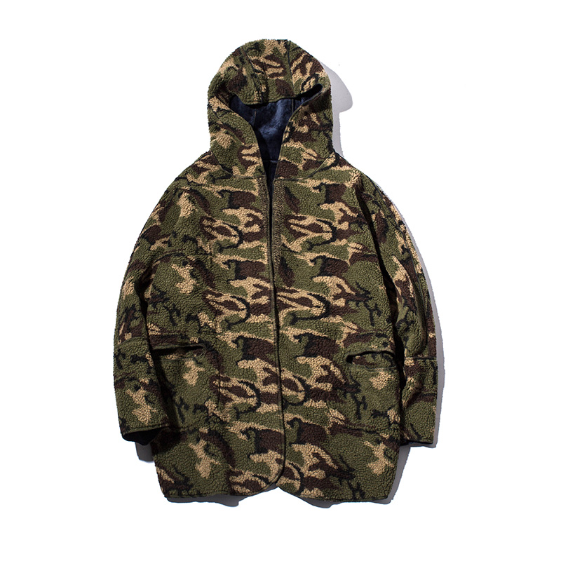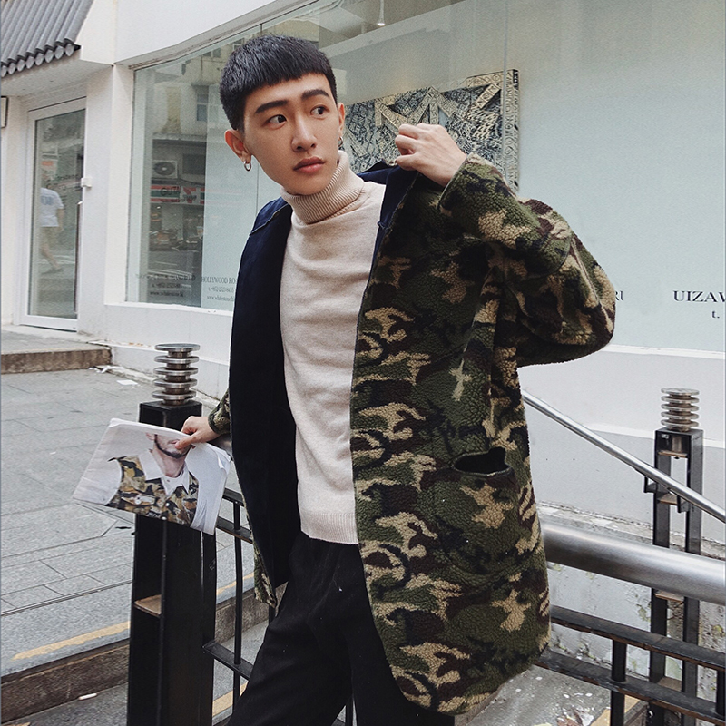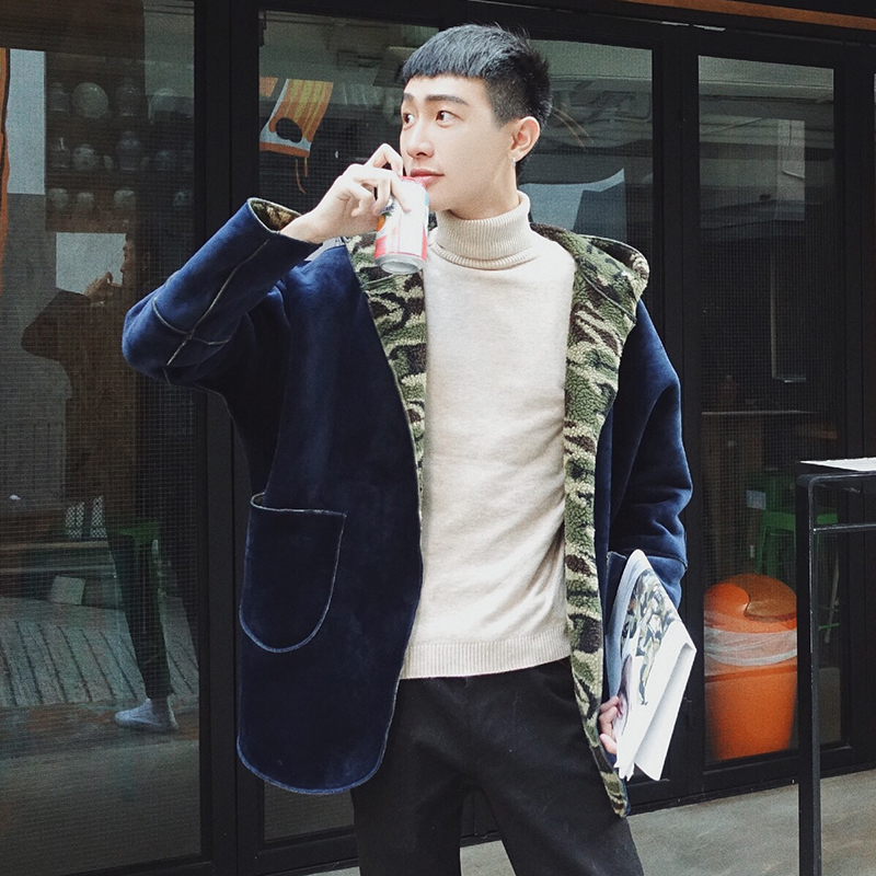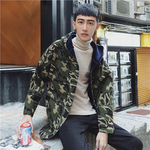 / 新款男裝潮男兩面穿加絨保暖男士迷彩連帽風衣外套