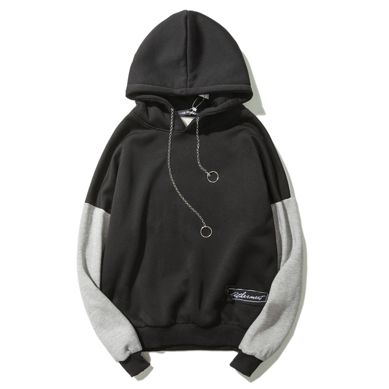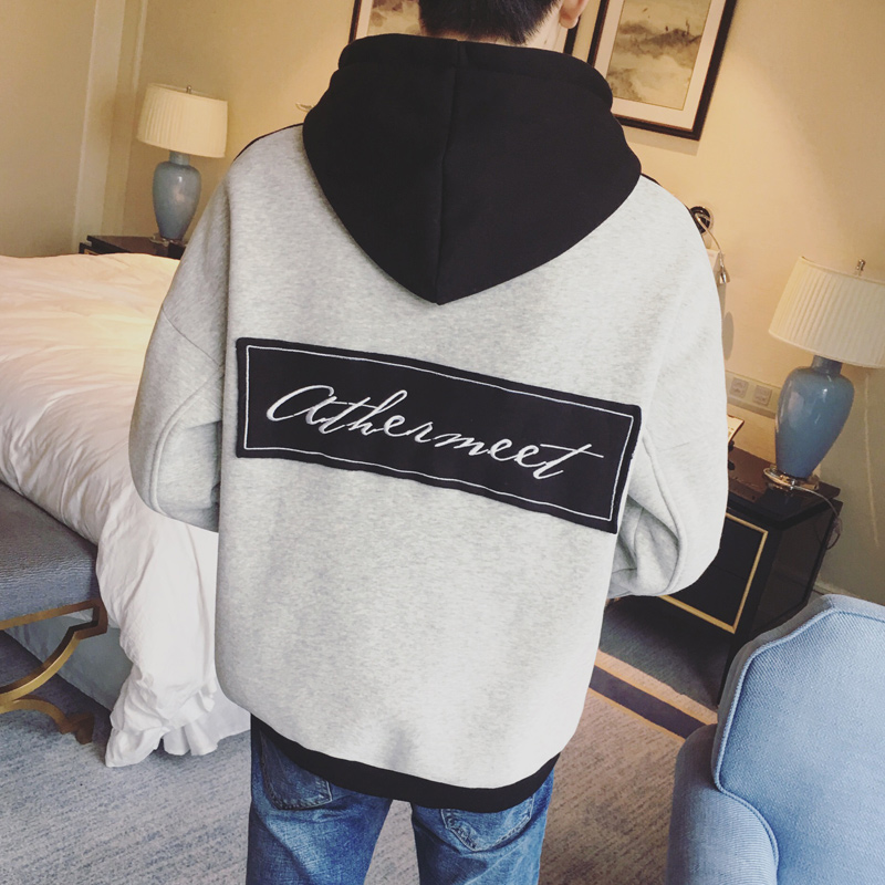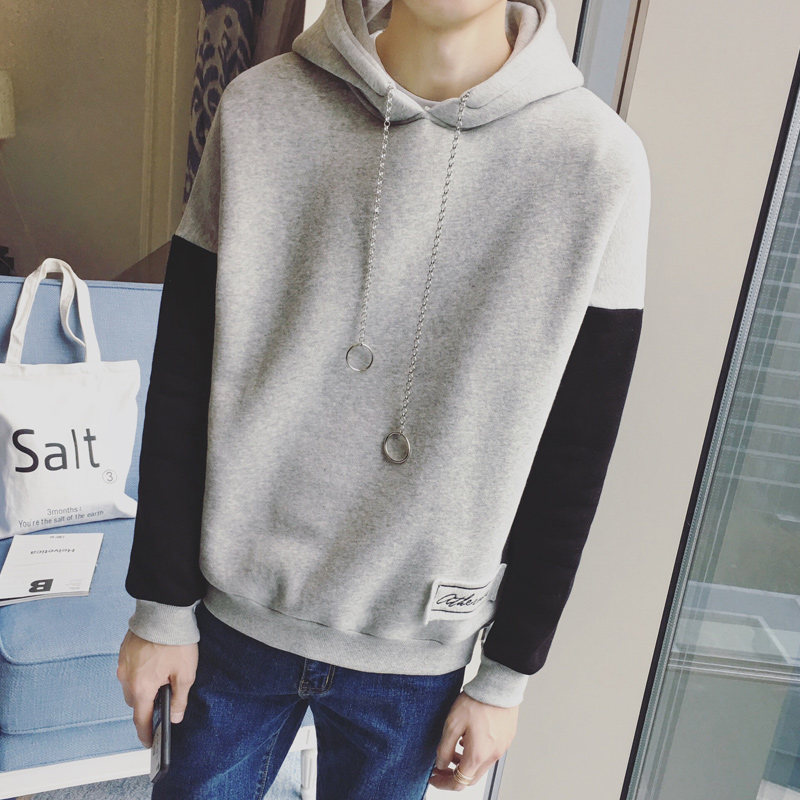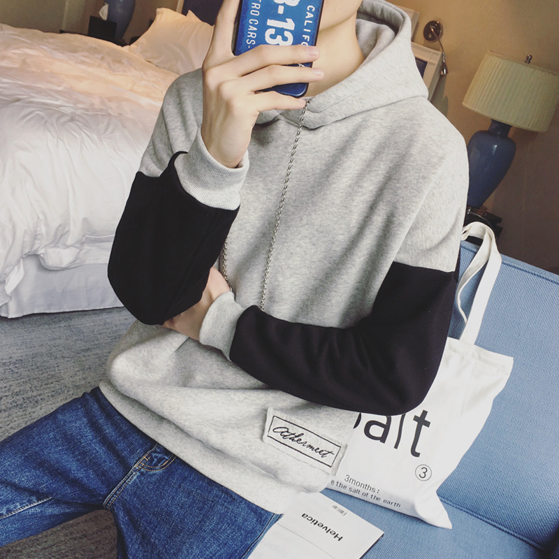 / 男裝韓版男士連帽套頭貼布拼色加絨運動衛衣外套