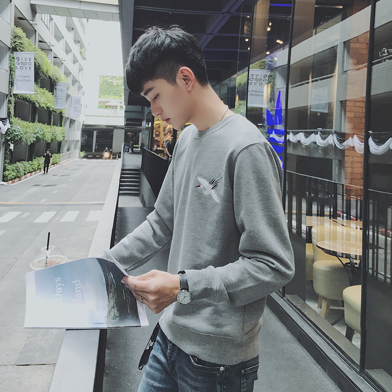 男裝日系復古仙鶴刺繡圓領套頭修身男士衛衣春裝