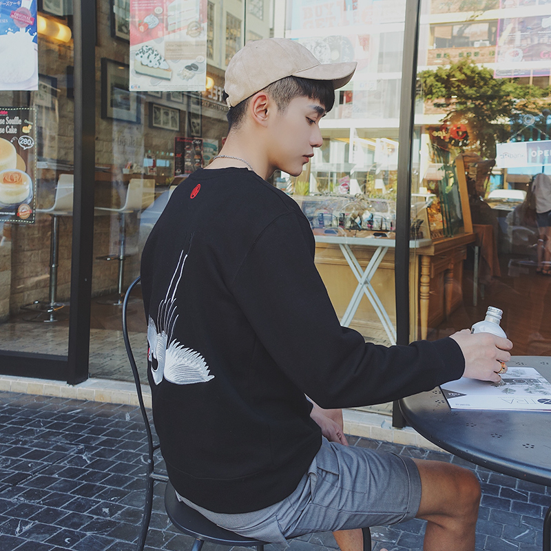 / 男裝日系復古仙鶴刺繡圓領套頭修身男士衛衣春裝