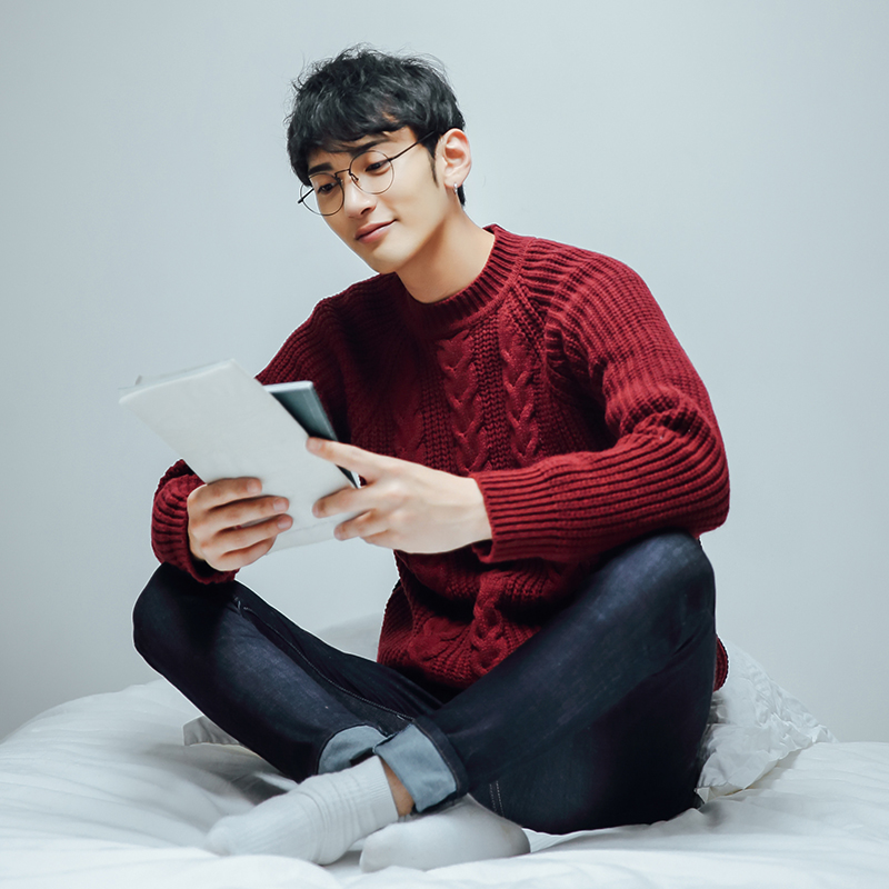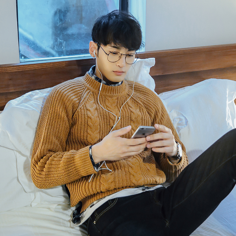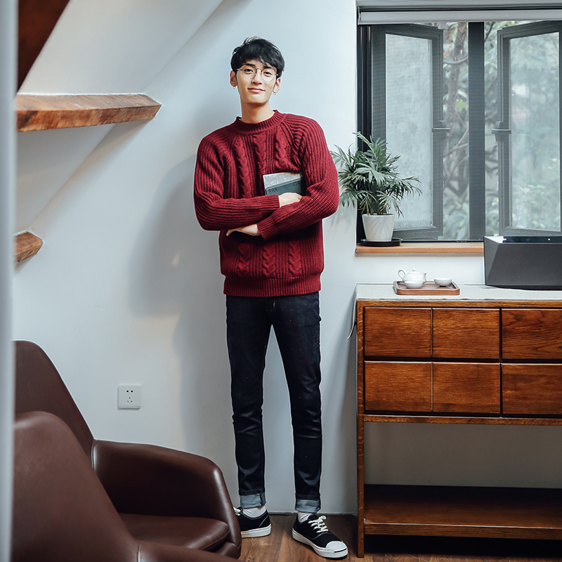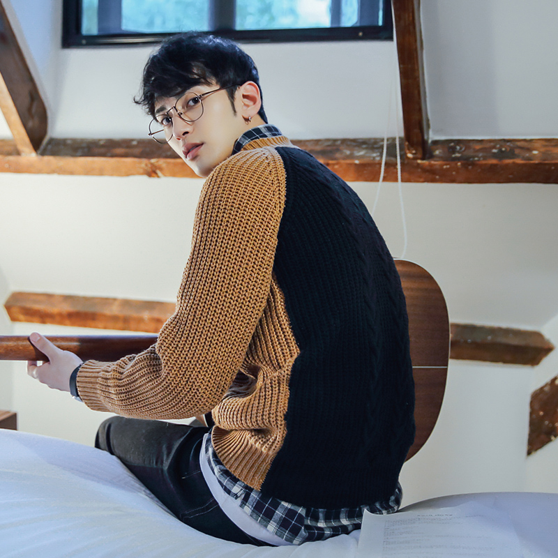 / 男裝粗線提花前后拼潮男套頭毛衣日韓插肩袖針織衫