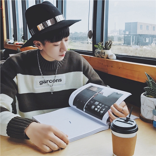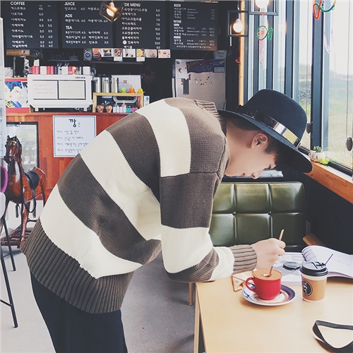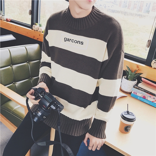 男裝字母刺繡韓版圓領寬條紋針織衫套頭毛衣外套男
