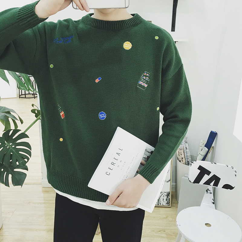 男裝韓版繡花卡通圖案針織衫圓領套頭毛衣打底衫男